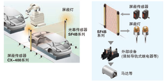 光幕傳感器SF4B系列檢測范圍230?1,910mm(Finger型到1,270mm)的豐富的變化。3種類型可以混合在一條直列上的連接。