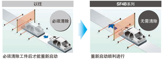 即使由于工件導致光幕傳感器處于被遮光狀態,從而使電源關閉時,或在進入屏蔽前(屏蔽傳感器只有一個被遮光的狀態)生產線停止時,裝置也可順利且安全地重新啟動,無需清除遮光的工件。