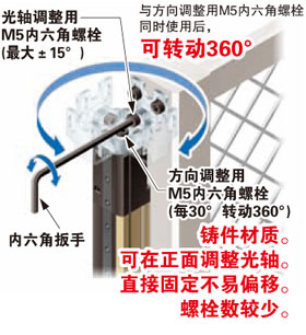 光軸調整用內六角螺栓安裝在正面,以確保工作效率。螺栓清晰可見,光軸調整輕松。此外,光軸調整器采用由M5螺栓直接切實固定的結構,光軸不易偏移。