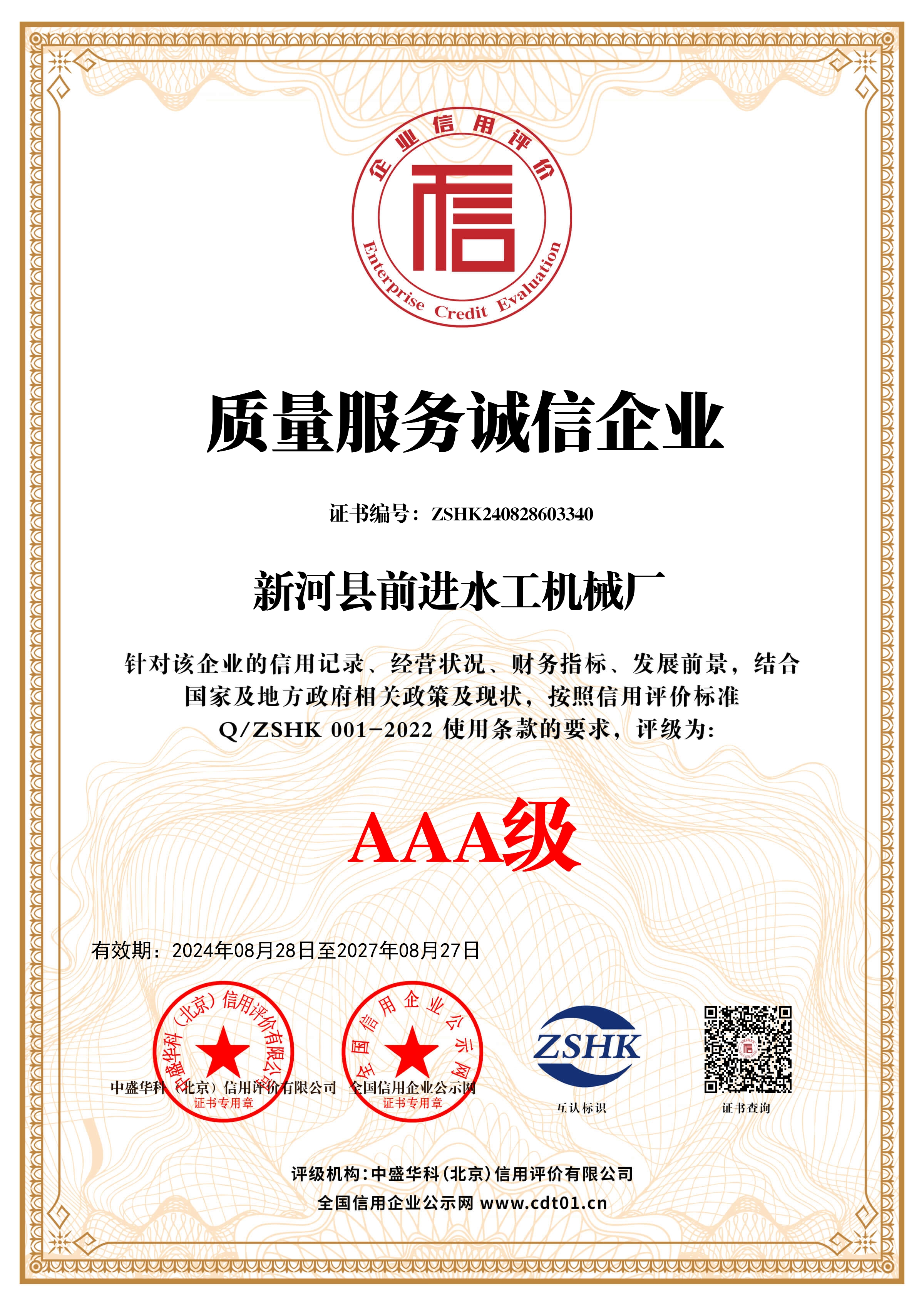 誠信企業信用等級證書